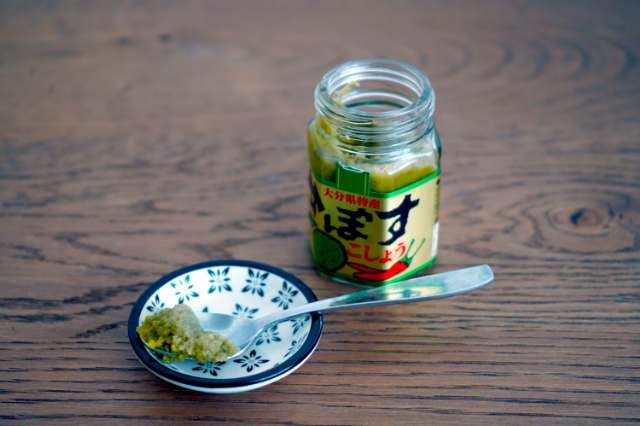 物産店で見かけて買ってみた「かぼすこしょう」。大分県特産のかぼすの皮を使った薬味で、ゆずこしょうのかぼす版のようなもの。柑橘特有の爽やかさに、ピリッとほどよい辛さが後引くうまさで、湯豆腐や鍋のおともにしたり、蒸したお肉に添えたり、パスタの隠し味にしたりと、さまざまな使い方ができます。