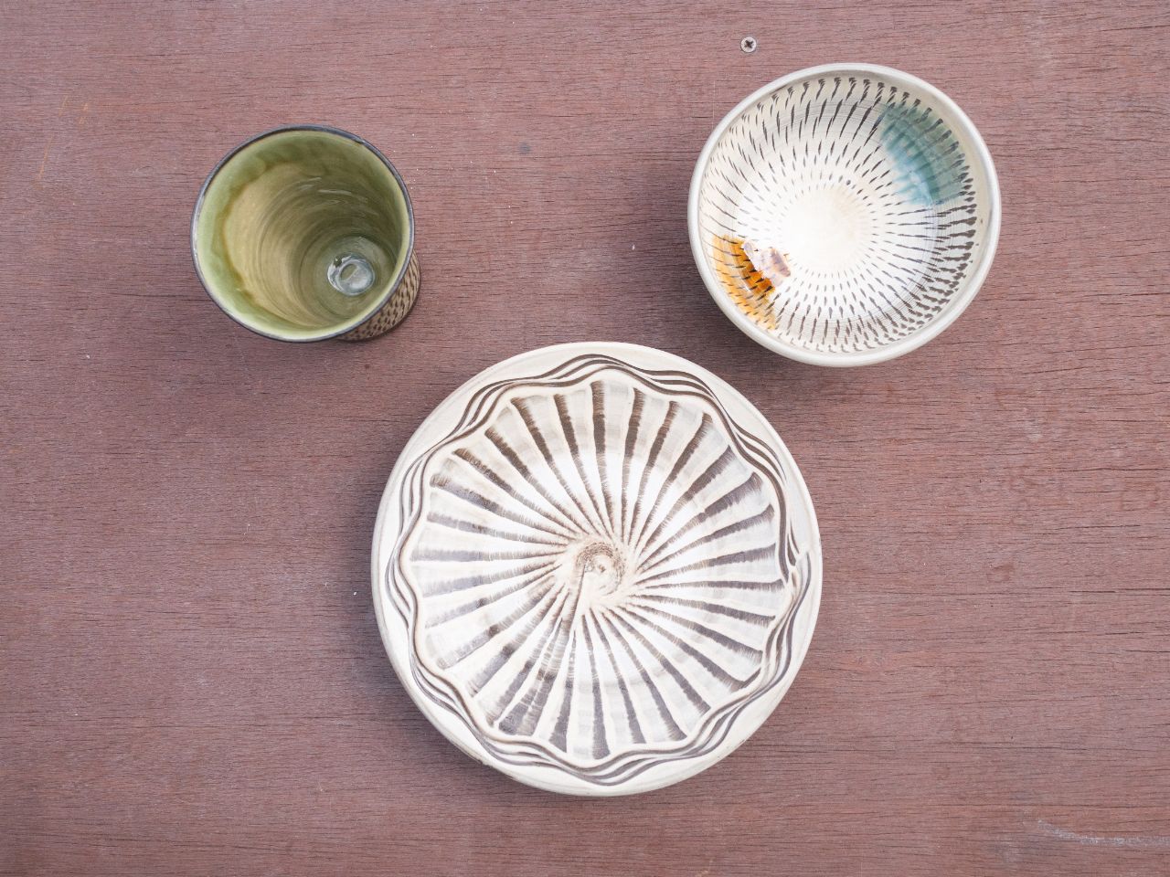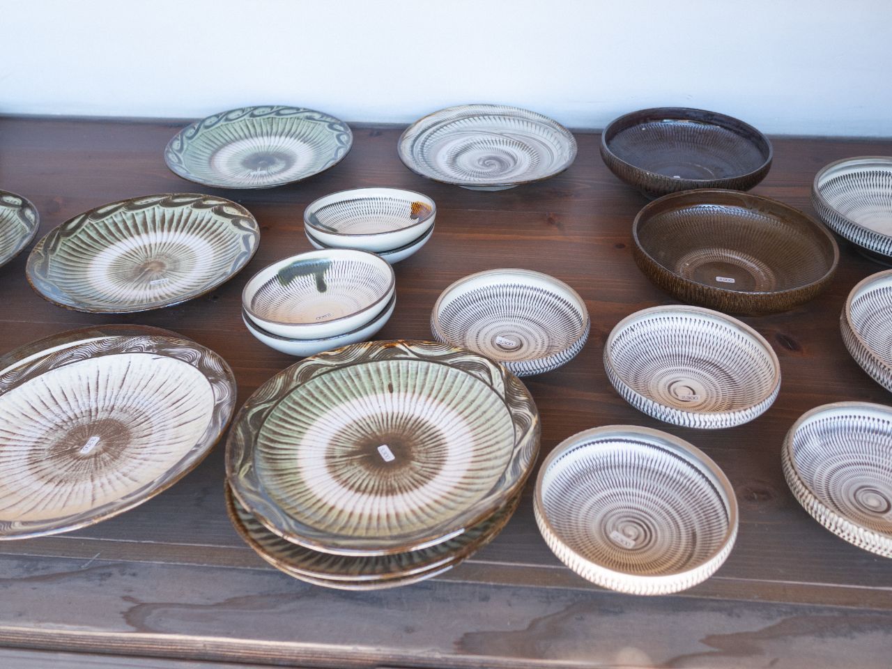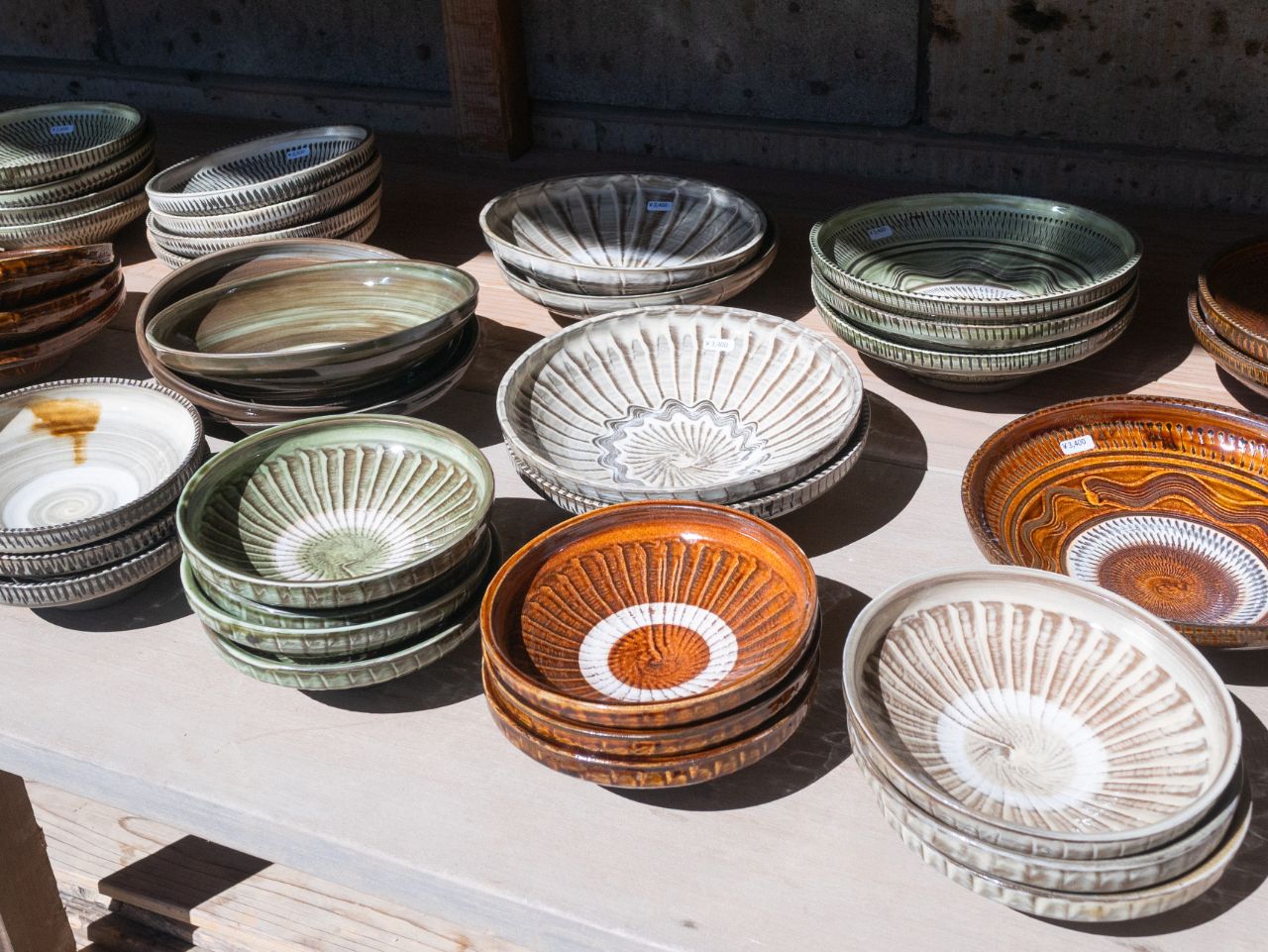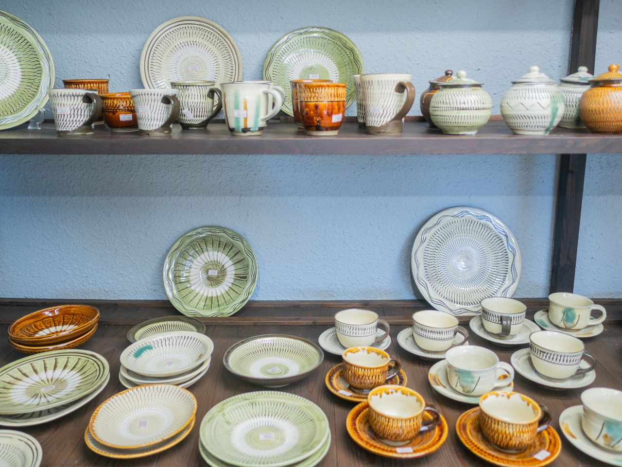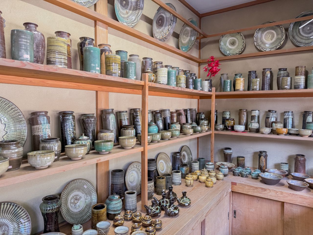 一方、嘉津才さんは「父と同じ模様をつくってもしょうがない」と語り、これまでなかった赤や濃い緑の釉を試したり、より深く長い飛び鉋を生み出すために自作の道具を工夫したりと、新しい表現を模索中なのだそう。好奇心を原動力に、色や模様の可能性を広げています。対照的なふたりの器が同じ棚に並ぶ光景も、この窯元の大きな魅力です。